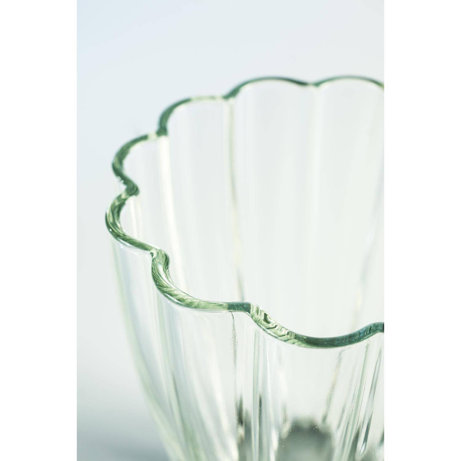 Piccolo vaso decorativo BEA di INNA Glas in vetro spesso 5 mm. Questo grazioso vaso da tavolo dal design ondulato misura 17 cm in altezza ed ha un diametro superiore di 14 cm ed inferiore di 8 cm.