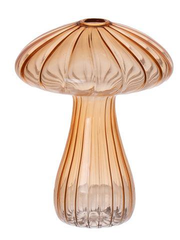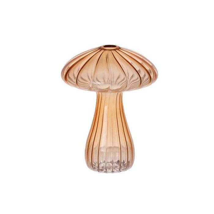Portafiori di vetro PULCHERIA, a forma di fungo, scanalature, ambra-trasparente, 13 cm, Ø10 cm