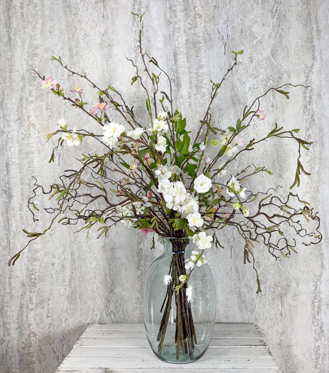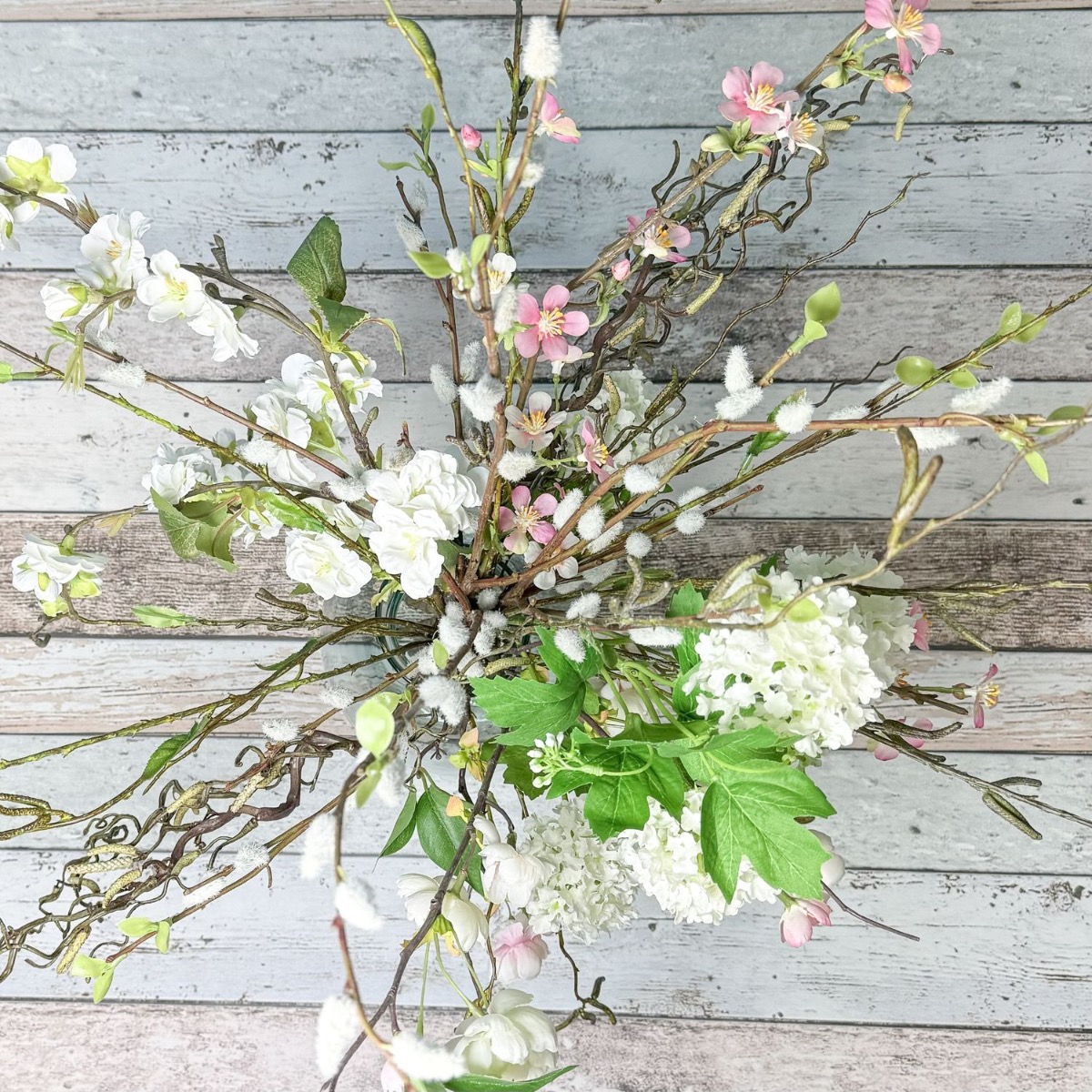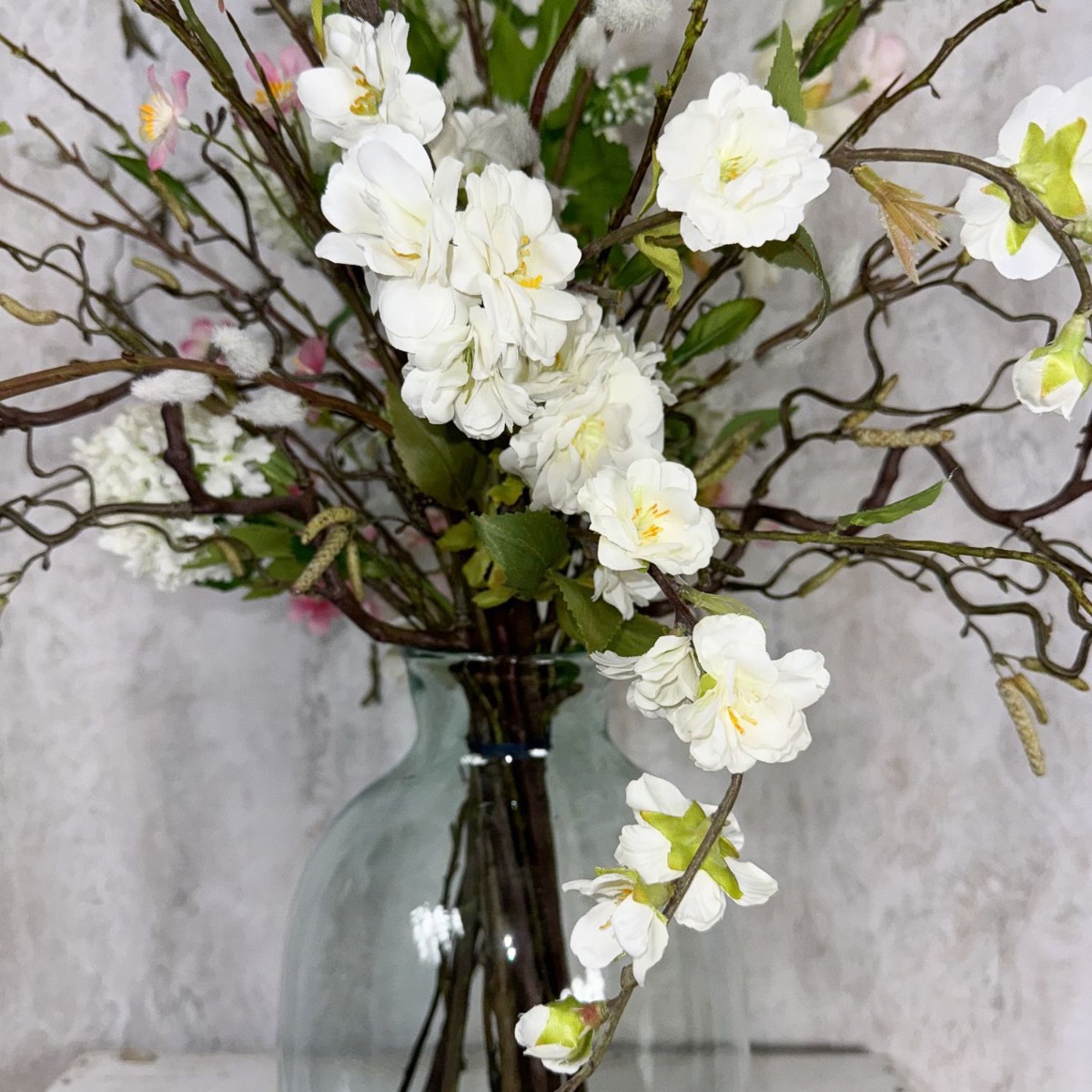 Selvaggio e in fiore! Christiane era ancora alla ricerca della giusta decorazione floreale per il suo studio, dove si tengono regolarmente seminari sul design di gioielli. Per lei era particolarmente importante che i rami dallo stelo lungo e i fiori delicati creassero un aspetto selvaggio e naturale. Venivano utilizzati rami di salice, nocciolo, betulla, melo, pesco e fiori di ciliegio. Un rigoglioso ramo di palle di neve completava l'insieme floreale. Il bouquet è disposto ad arte, con i rami intrecciati in una danza armoniosa. Alcuni rami si inclinano elegantemente verso il basso mentre altri si estendono fieri verso il cielo, ma insieme formano una composizione equilibrata ed esteticamente gradevole. Vuoi anche tu avere un vero colpo d'occhio che incarni la bellezza della primavera in tutto il suo splendore e riempia di gioia il cuore di chi la vede? Acquista il look!