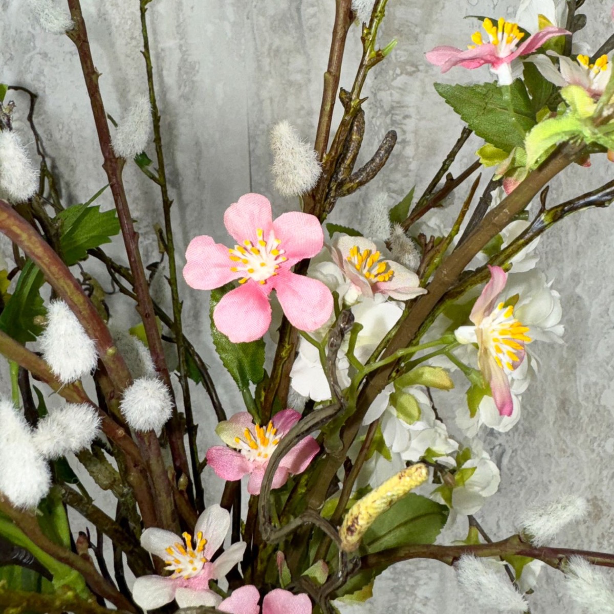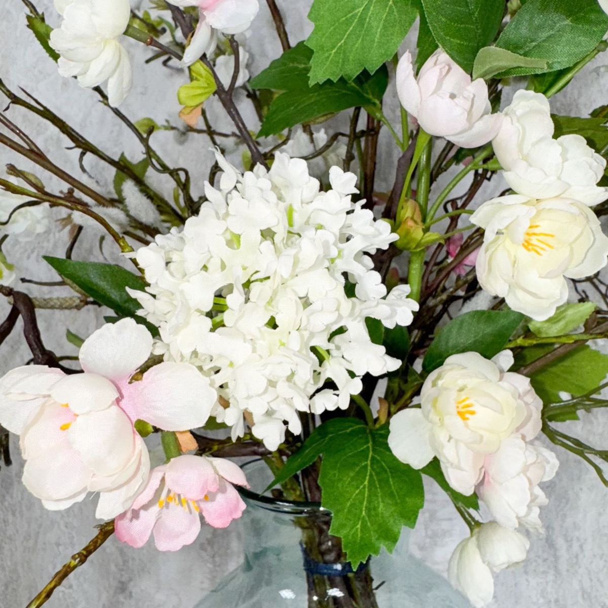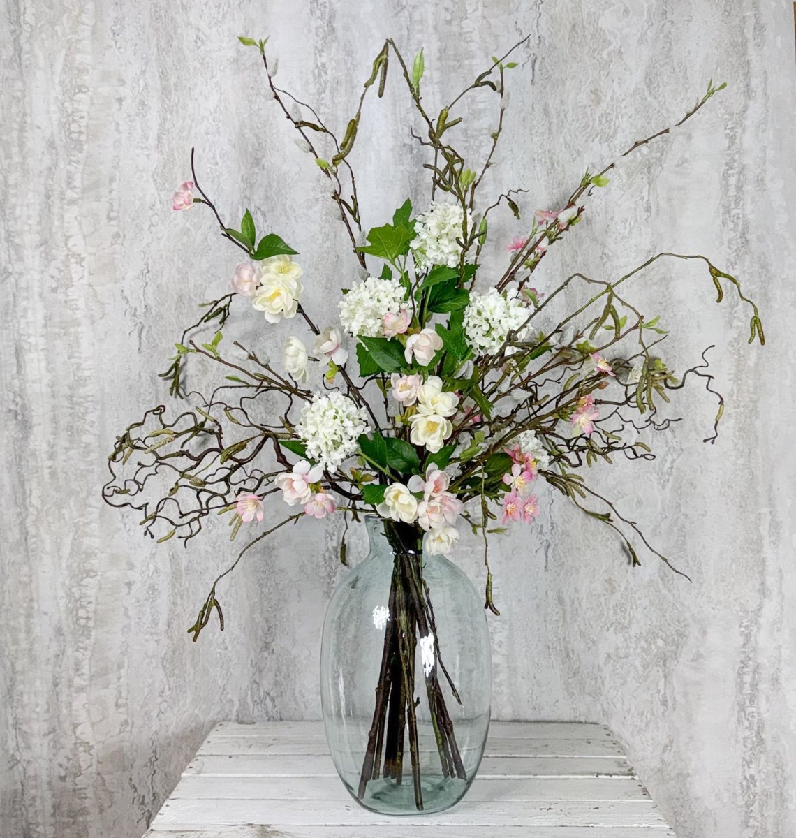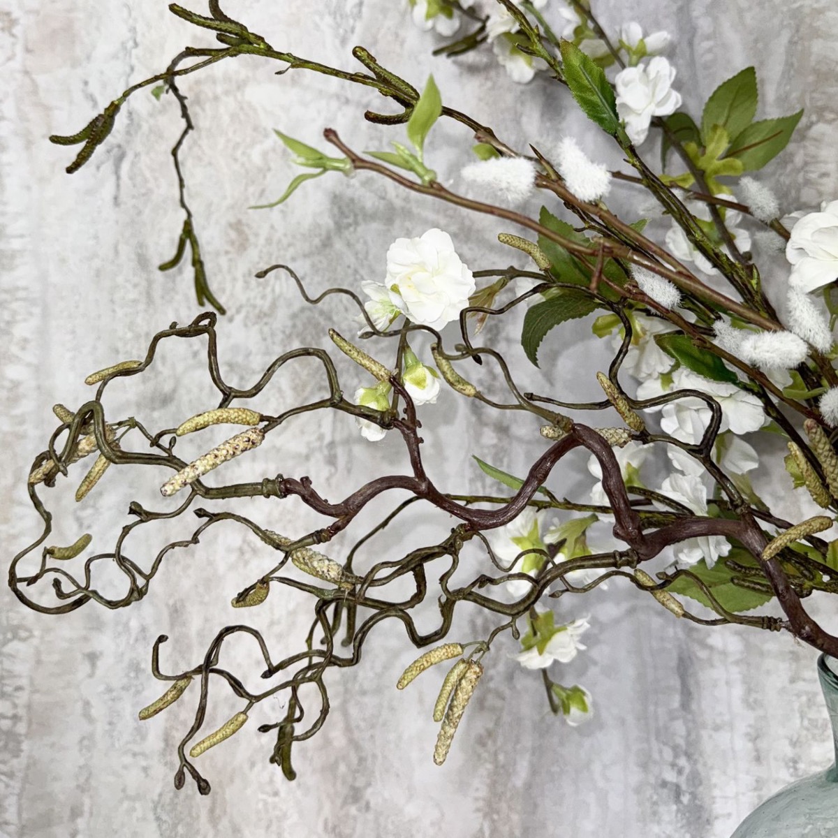 Selvaggio e in fiore! Christiane era ancora alla ricerca della giusta decorazione floreale per il suo studio, dove si tengono regolarmente seminari sul design di gioielli. Per lei era particolarmente importante che i rami dallo stelo lungo e i fiori delicati creassero un aspetto selvaggio e naturale. Venivano utilizzati rami di salice, nocciolo, betulla, melo, pesco e fiori di ciliegio. Un rigoglioso ramo di palle di neve completava l'insieme floreale. Il bouquet è disposto ad arte, con i rami intrecciati in una danza armoniosa. Alcuni rami si inclinano elegantemente verso il basso mentre altri si estendono fieri verso il cielo, ma insieme formano una composizione equilibrata ed esteticamente gradevole. Vuoi anche tu avere un vero colpo d'occhio che incarni la bellezza della primavera in tutto il suo splendore e riempia di gioia il cuore di chi la vede? Acquista il look!