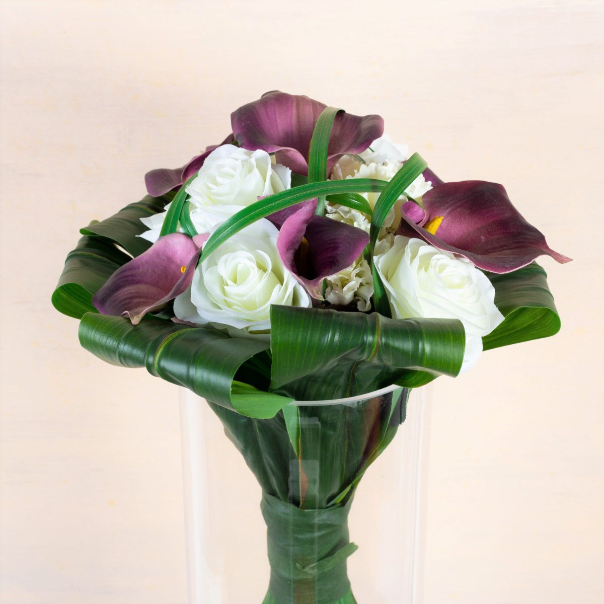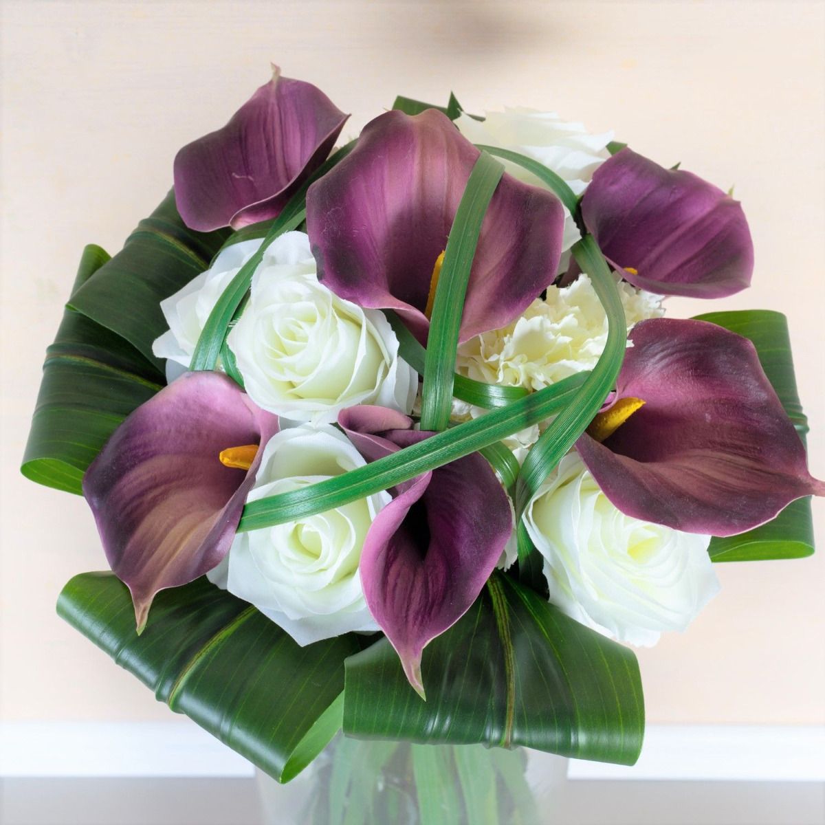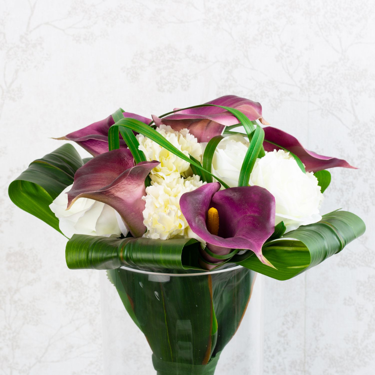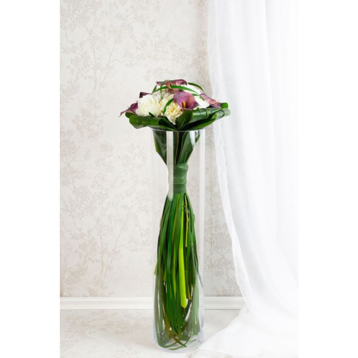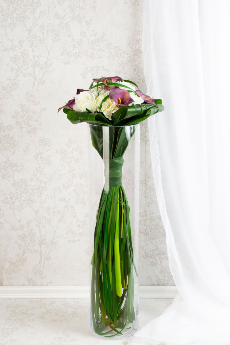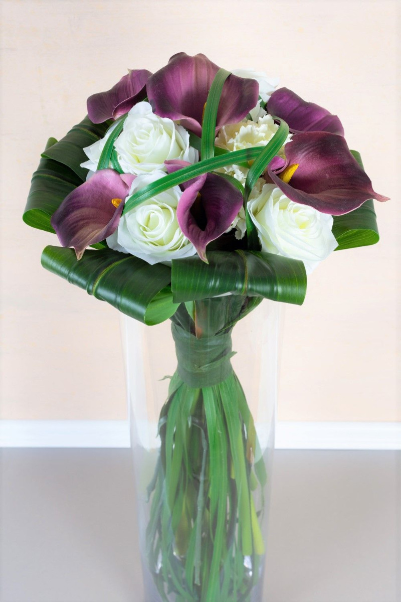 Il bouquet da sposa per l'eternità! Janine ci ha contattato telefonicamente. Ci ha parlato del suo bouquet da sposa e del suo desiderio di realizzarlo con fiori artificiali come ricordo del suo grande giorno. Ci ha inviato una foto del suo stravagante bouquet di scettro/bacchetta. Come è tipico per questo tipo di bouquet artificiale, si è presentato con steli e fili d'erba straordinariamente lunghi, che formano uno scettro attraverso un nastro largo e stretto. La scelta dei fiori è caduta su calle nobili, rose classiche e garofani bianchi in segno di fedeltà. Foglie di giglio avvolte fanno da cornice. Abbiamo potuto scegliere i fiori artificiali come descritto. Legare il nostro primo bouquet decorativo di scettri ci ha posto inizialmente una sfida. A causa della superficie artificiale liscia, le foglie scivolavano quando venivano legate insieme. Anche i fili d'erba potevano essere legati solo stelo per stelo e con difficoltà. Abbiamo presentato con orgoglio la nostra prima proposta a Janine. Era entusiasta del nostro lavoro, ma desiderava dei fiori più piccoli, perché nell'originale non erano così grandi. Le rose e i garofani sono stati trovati rapidamente in magazzino, ma un'altra calla viola non era disponibile nel nostro assortimento. Abbiamo quindi cercato in numerosi elenchi di fornitori un fiore di questo tipo. Questo ha richiesto molto tempo, ma alla fine è stato premiato in modo positivo. Senza ulteriori indugi, abbiamo ordinato la piccola calla e l'abbiamo aggiunta al nostro assortimento. Sostituendo i fiori, il bouquet finto ha perso subito il suo diametro. Ora anche le dimensioni corrispondevano all'originale, il che significa che abbiamo ricevuto l'approvazione dell'ordine anche da questo cliente. Volete anche voi un bouquet da sposa artificiale per l'eternità? Acquistate il look!
